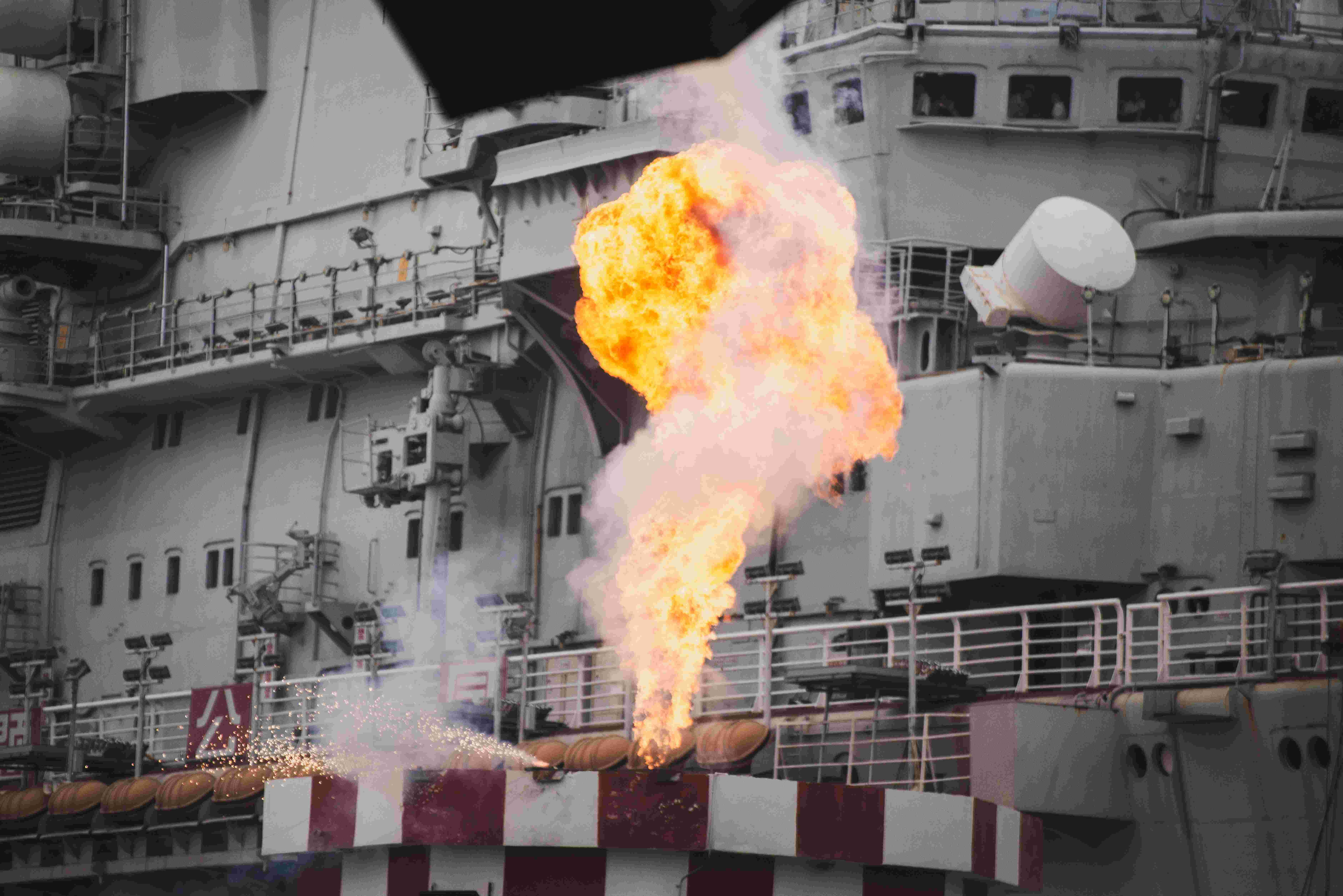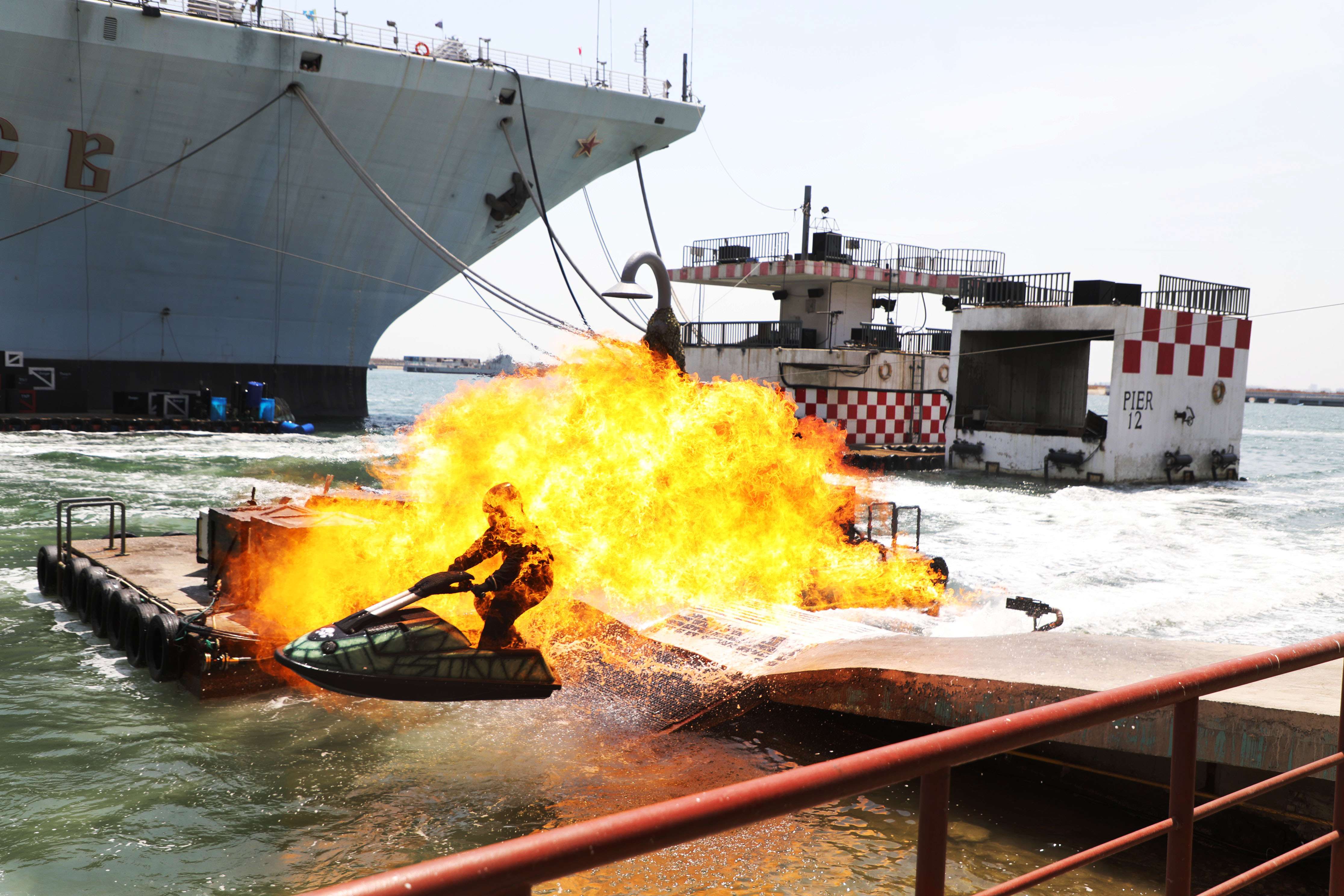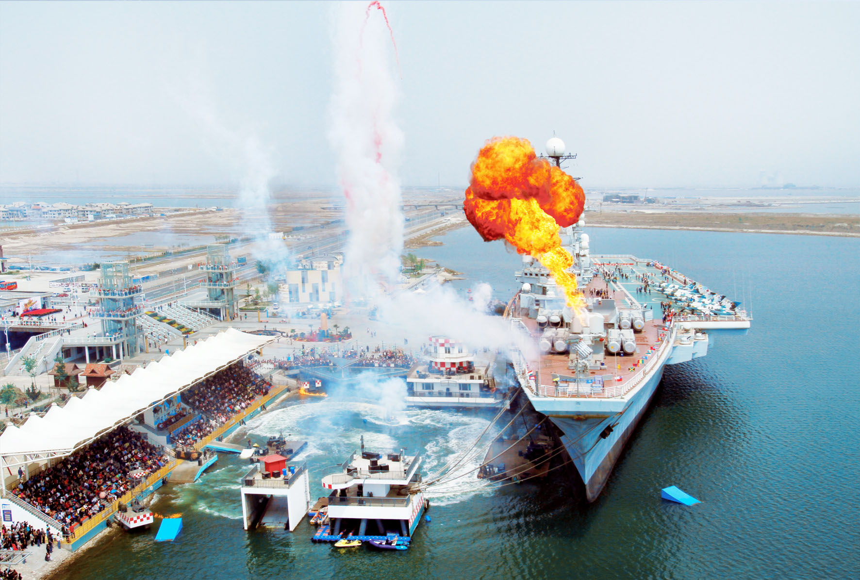 《航母風暴》,是泰達航母打造的世界首部以真實航母為題材的大型實景海戰表演劇。該劇由好萊塢金牌班底制作,全球著名特技演員領銜,恢復并利用航母原有武備系統,整場表演使用跳船、風扇機船、海豚潛水艇、橡皮艇、水上飛行器等先進道具,通過潛水、跳水、滑繩、速降、爆破等特技特效表演,為您震撼呈現現場版“國際大片”。該劇一經推出,即受到游客熱烈追捧,現已成為航母公園的王牌節目?!逗侥革L暴》每年五月至十月上演。