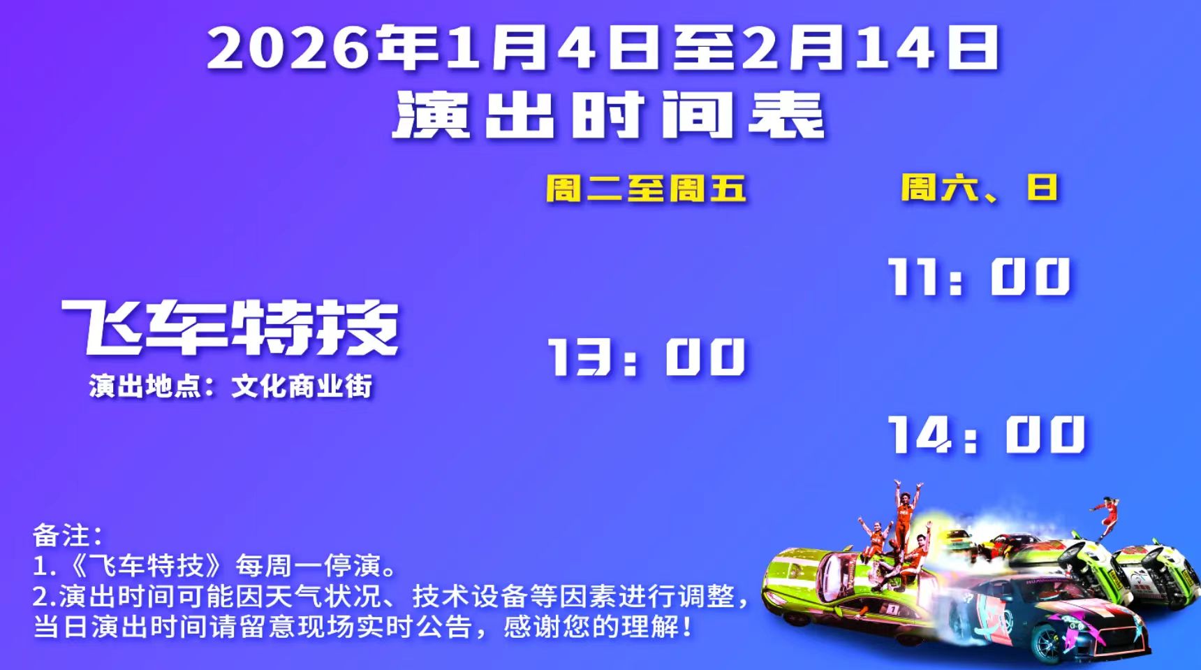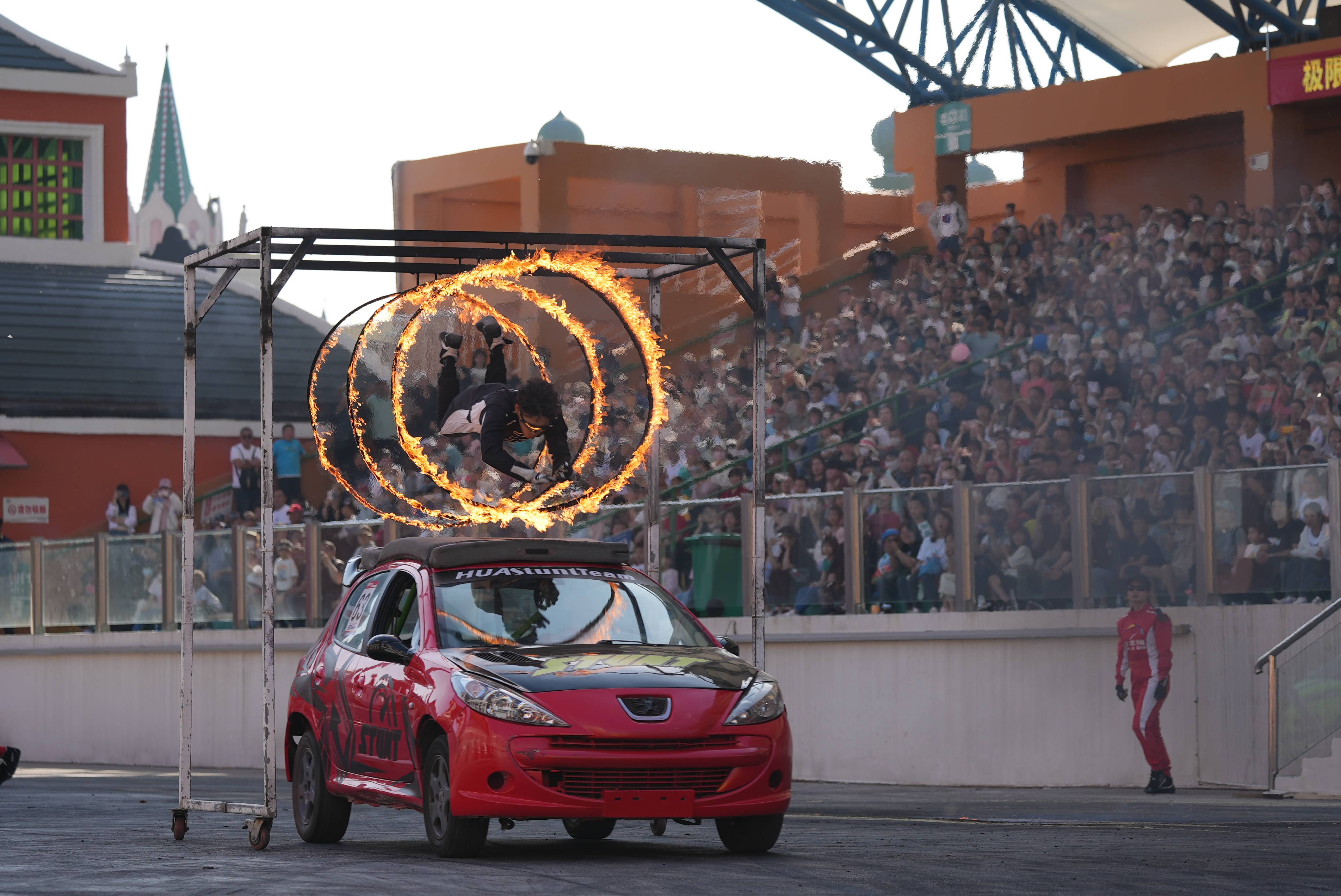 作為《飛車特技》的2.0升級版,演出場內近 200 米的加長跑道設計,為賽車發揮極致性能提供絕佳舞臺。演出中令人矚目的全國首座 12 米高的摩天輪大轉環挑戰在此呈現。經過改裝后的賽車將在摩天輪上完成 360 度旋轉,挑戰人車合一的極限境界。此外,演出中更有緊張刺激的雙車追逐、華麗漂移等環節,讓游客隨著引擎的轟鳴聲,開啟速度和勇氣的傳奇之旅!